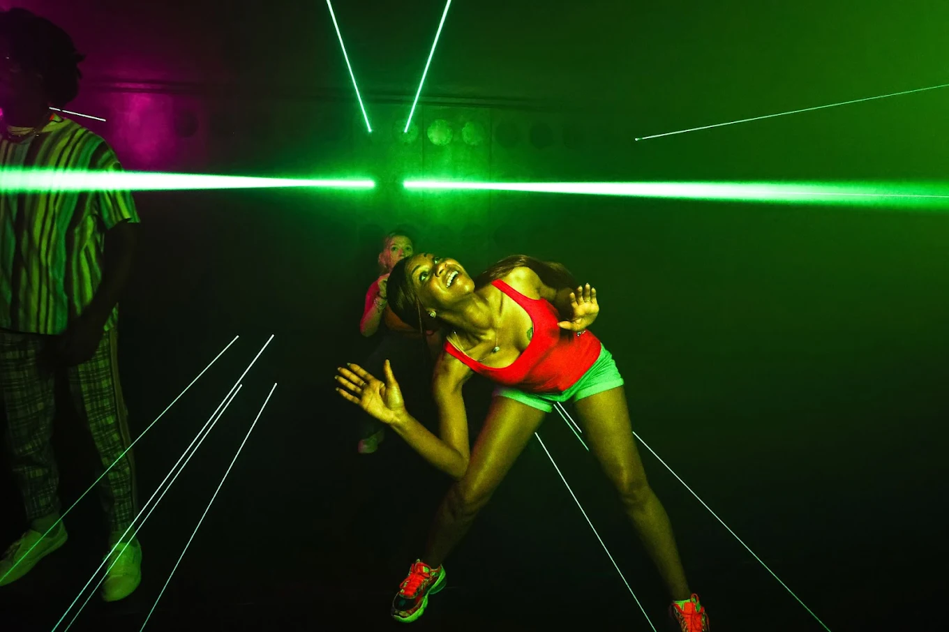 Bring your crew (2–5 players) and dive into challenges like laser mazes, puzzle solving, and team-based missions. You’ll explore different rooms — think Mega Grid, Mega Laser, Hoops, and more — each an interactive light-up game room that reacts in real time. Your wristband tracks points and levels up as you conquer each task, making every visit feel fresh and competitive.