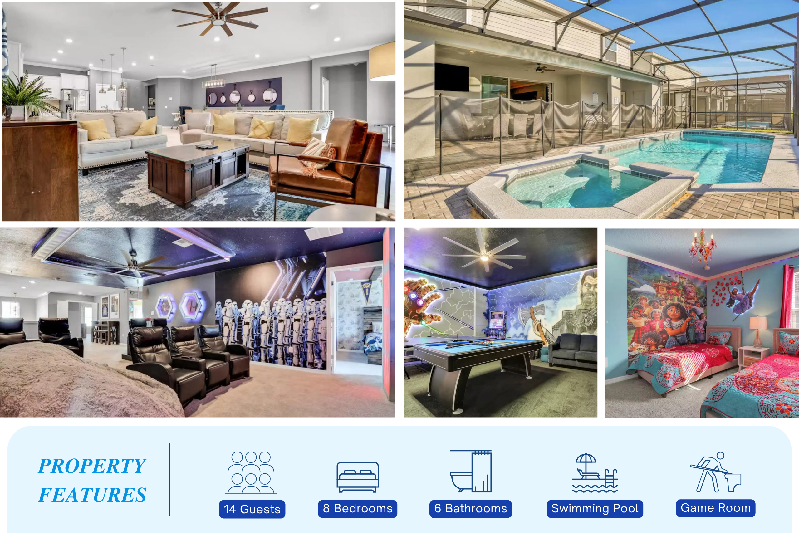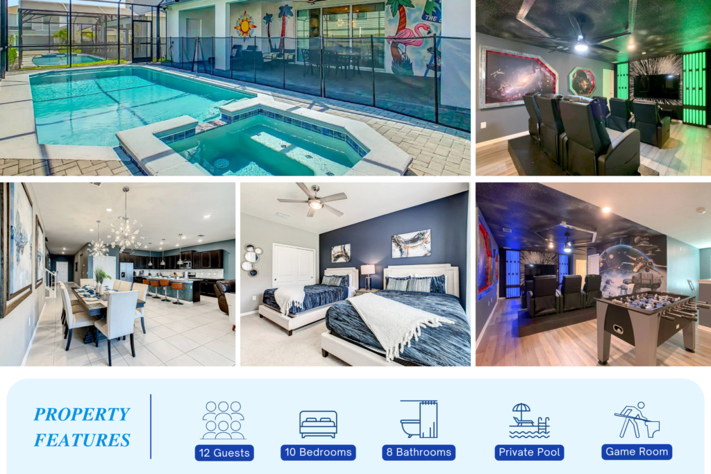 The home features a private pool and spa, theatre room, and game area designed for entertainment and relaxation. A gourmet kitchen, stylish living room, and spacious lanai with alfresco dining create a comfortable setting for memorable group stays.